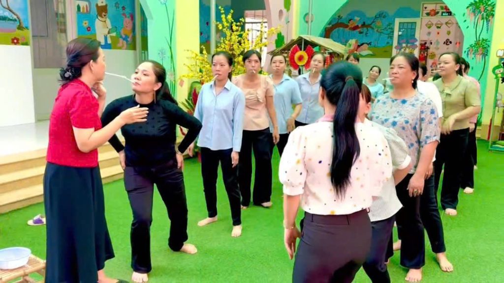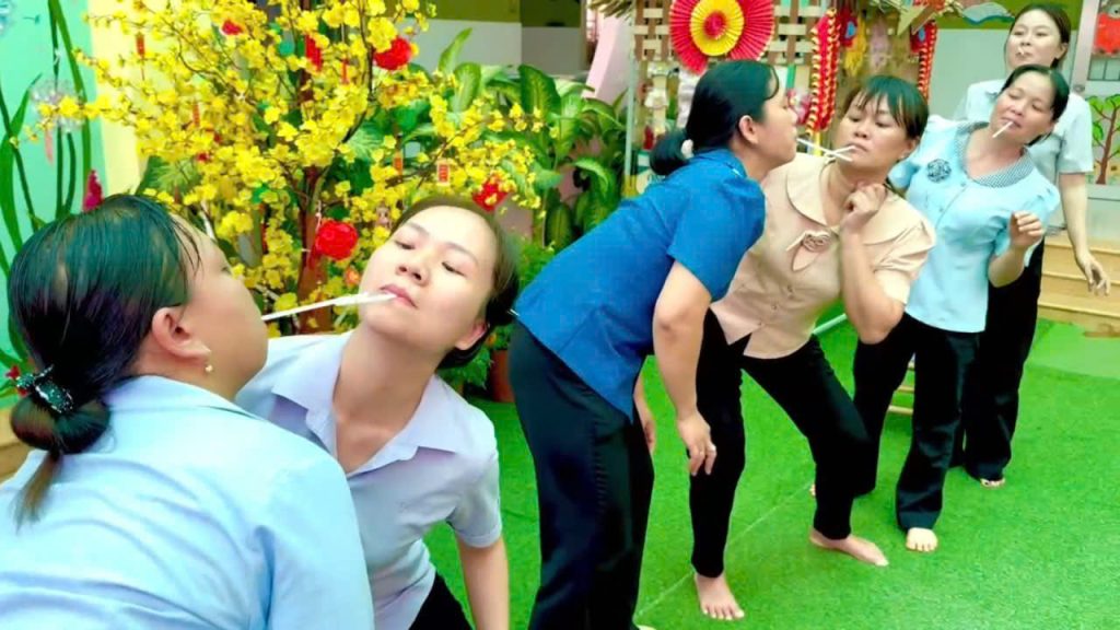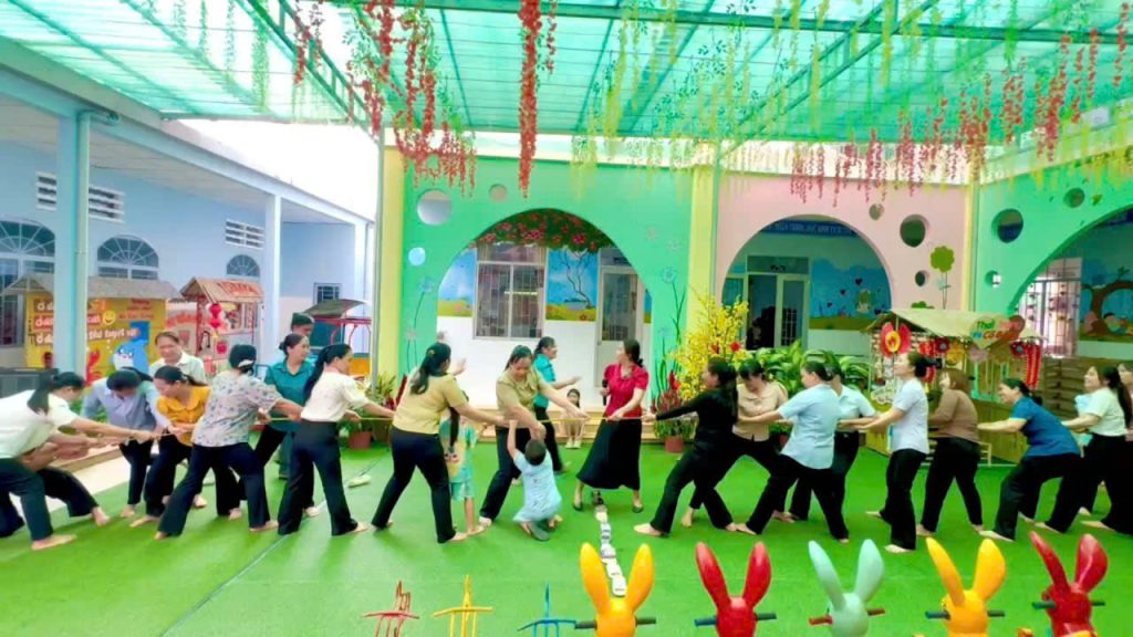 💛 Không khí chương trình trở nên sôi nổi với các trò chơi tập thể như kéo co và chuyền thun bằng ống hút, thu hút sự tham gia nhiệt tình của các cô. Những tiếng cười, lời cổ vũ đã tạo nên một buổi giao lưu đầy năng lượng, góp phần gắn kết tình đồng nghiệp trong tập thể nhà trường.