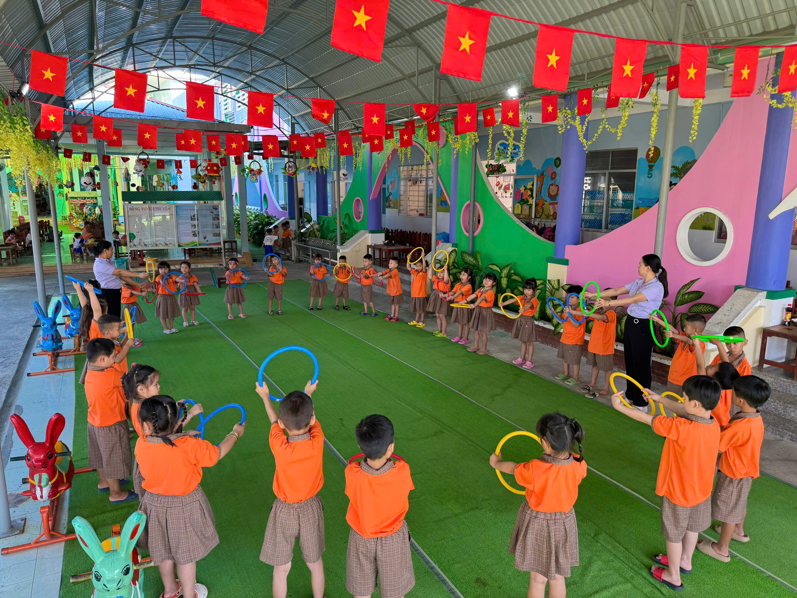 Sau những giây phút lắng đọng và ý nghĩa, toàn thể nhà trường đã chuyển sang hoạt động thể chất sôi nổi, hưởng ứng tinh thần Đại hội Thể dục Thể thao xã. Buổi thể dục sáng được bắt đầu với phần khởi động nhẹ nhàng theo nhạc, giúp làm nóng cơ thể. Tiếp đó, tất cả các bé, từ khối Mầm đến khối Lá, đã cùng nhau thực hiện các bài tập thể dục nhịp điệu đồng bộ với âm nhạc. Các bé tập trung vào các động tác phát triển Hô hấp, Tay, Bụng lườn, Chân bật, thể hiện sự phối hợp nhịp nhàng và tinh thần đồng đội. Buổi tập diễn ra tràn đầy năng lượng, các bé thể hiện niềm vui thích, yêu thích vận động hơn sau khi nghe câu chuyện về Bác.