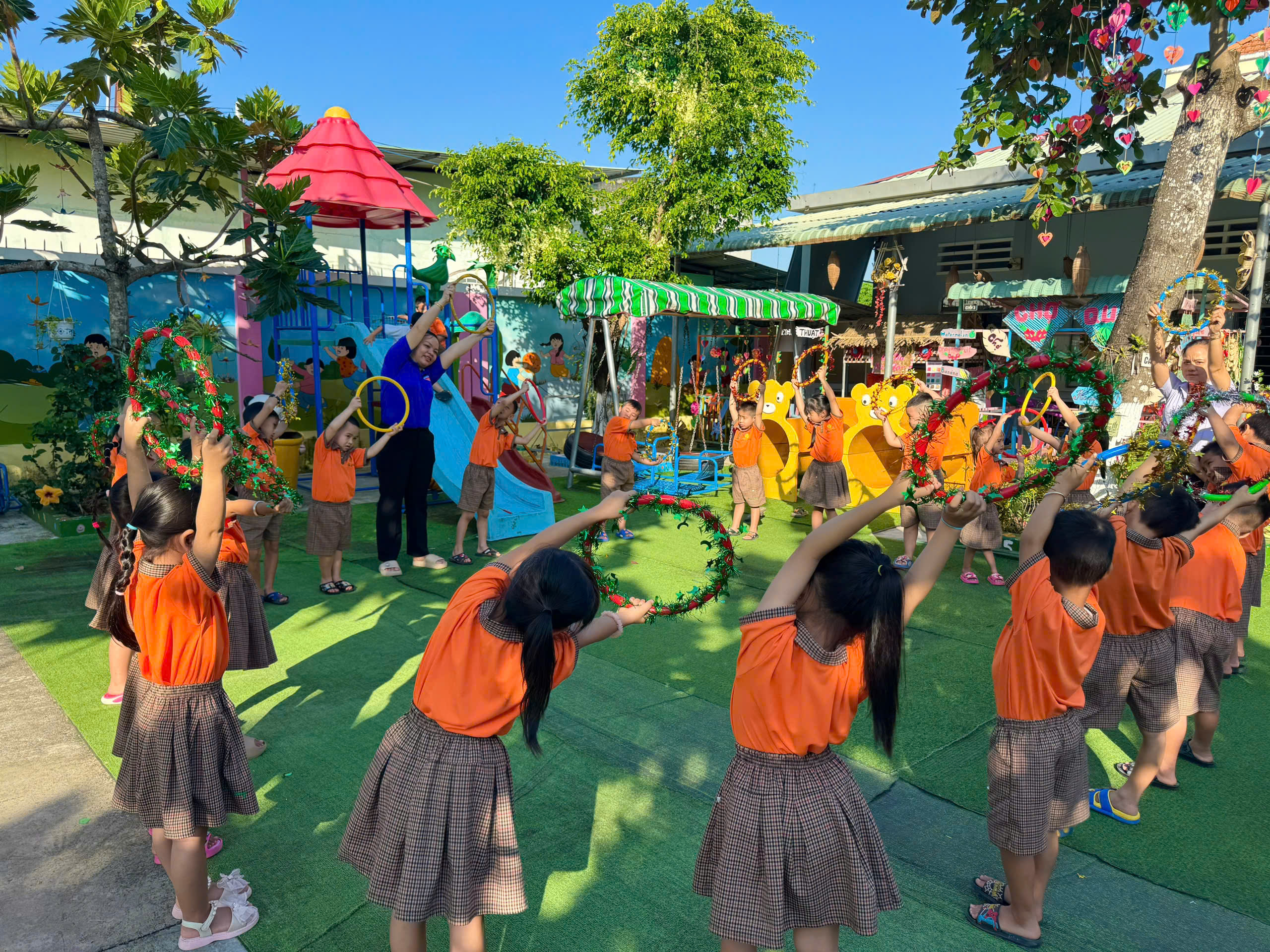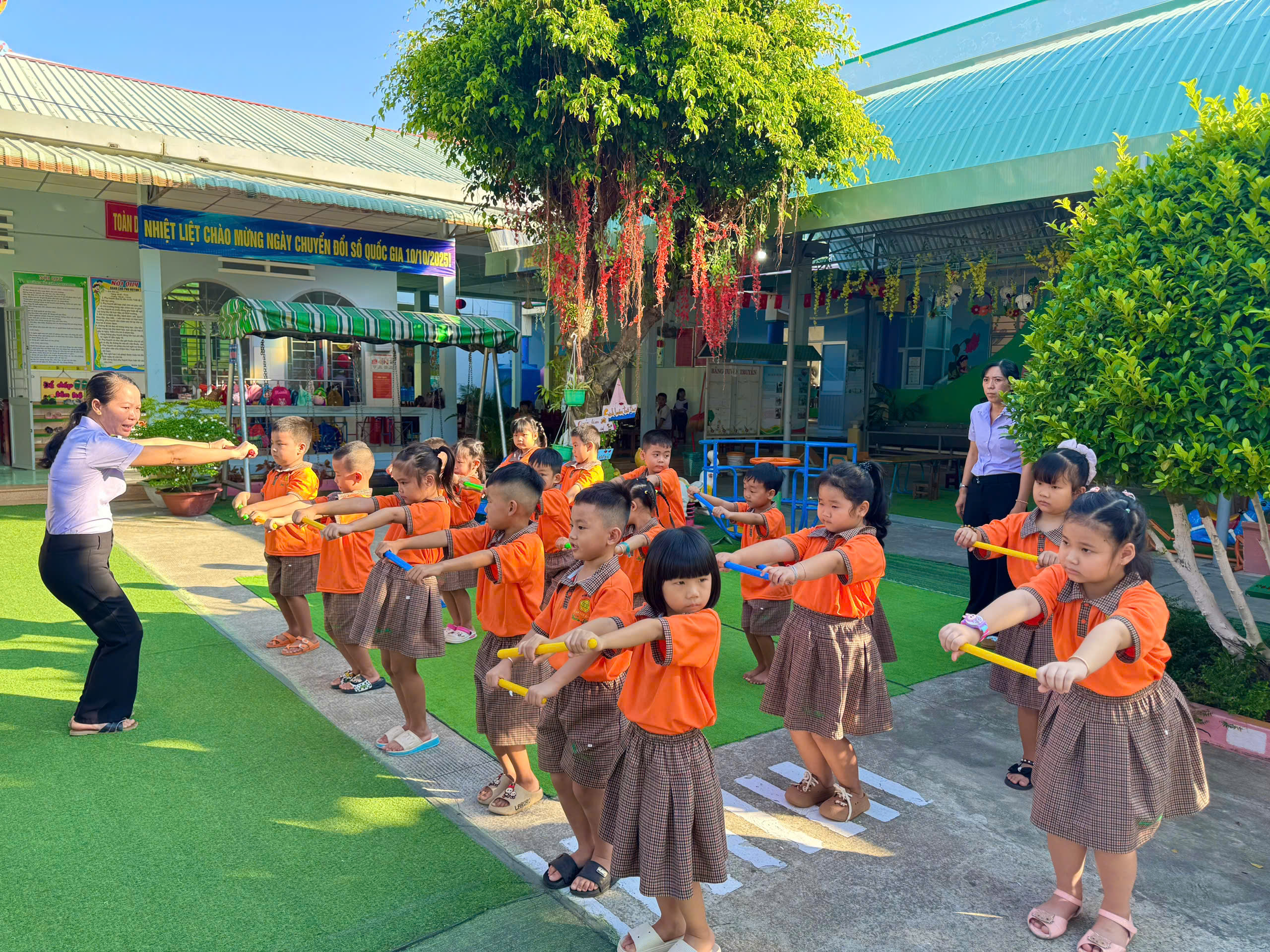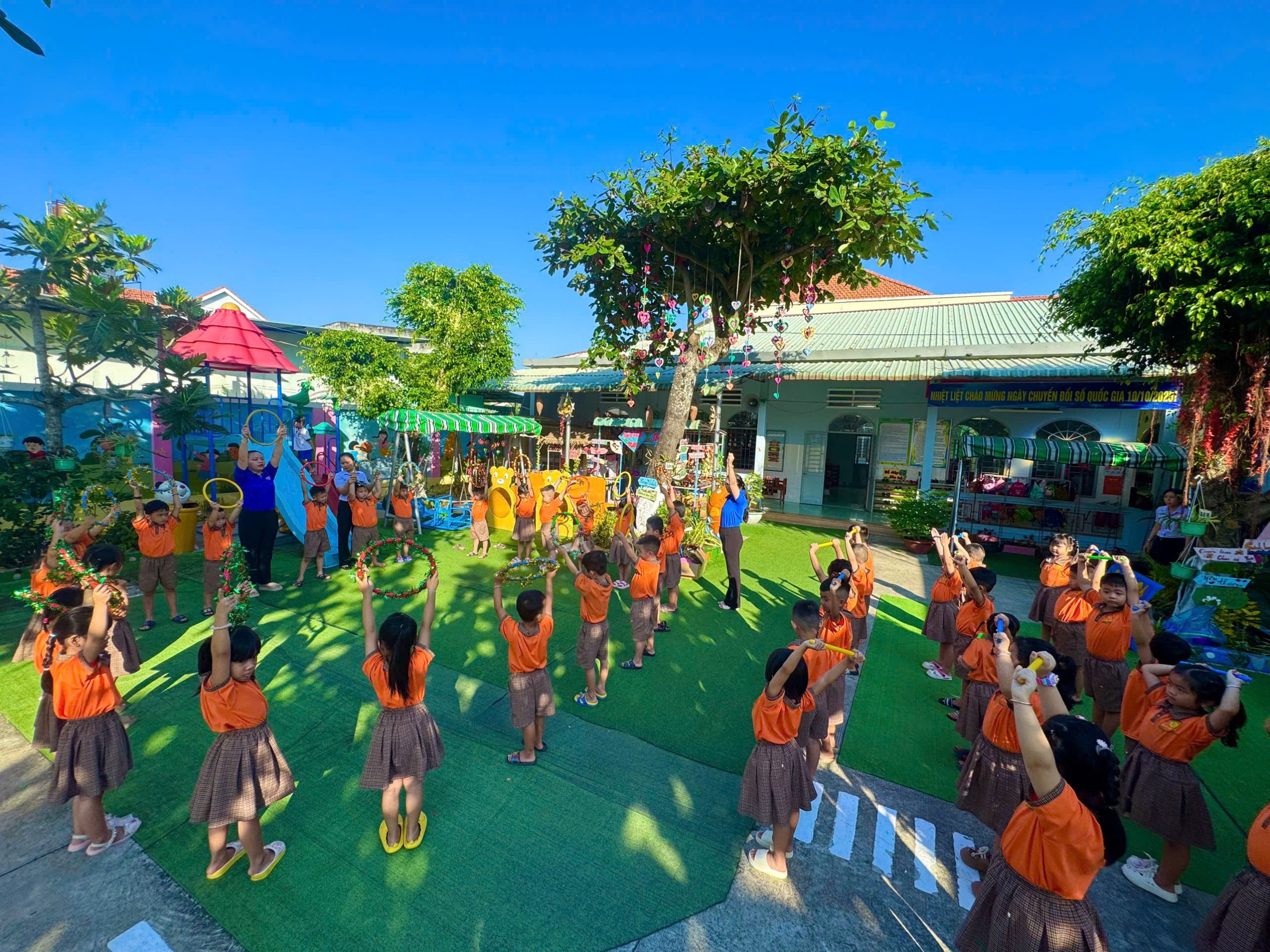 Sau những giây phút lắng đọng và ý nghĩa, toàn thể nhà trường đã chuyển sang hoạt động thể chất sôi nổi, hưởng ứng tinh thần Đại hội Thể dục Thể thao xã. Buổi thể dục sáng được bắt đầu với phần khởi động nhẹ nhàng theo nhạc, giúp làm nóng cơ thể. Tiếp đó, tất cả các bé, từ khối Mầm đến khối Lá, đã cùng nhau thực hiện các bài tập thể dục nhịp điệu đồng bộ với âm nhạc. Các bé tập trung vào các động tác phát triển Hô hấp, Tay, Bụng lườn, Chân bật, thể hiện sự phối hợp nhịp nhàng và tinh thần đồng đội. Buổi tập diễn ra tràn đầy năng lượng, các bé thể hiện niềm vui thích, yêu thích vận động hơn sau khi nghe câu chuyện về Bác.